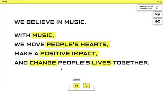 사명은 바뀌지만 '음악에 기반을 둔다'라는 기업의 본질은 그대로 유지된다. 빅히트는 새로운 미션 'We believe in music'을 발표하고 '음악으로 감동을 전하고 선한 영향력을 나누며 삶의 변화를 만들어 간다'라는 지향점을 분명히 했다. 회사의 근간인 빅히트의 레이블 부문은 '빅히트 뮤직'이라는 레이블로서 존속하며 정체성을 잇는다. 하이브의 새로운 심볼 역시 다양한 화음을 쌓은 오선보가 하나의 가로선으로 압축된 모습으로 표현돼 음악에서 출발해 다양한 영역으로 확장하는 기업의 정체성과 가치를 담았다.