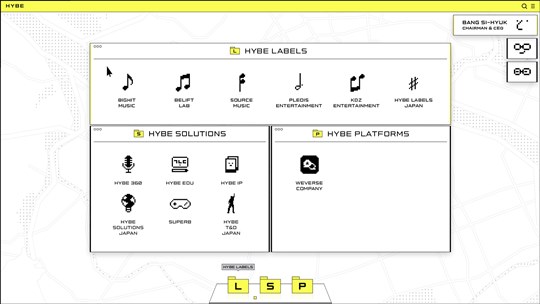 빅히트는 레이블과 솔루션, 플랫폼 세 축의 조직 구조를 명료화하고, 이를 통해 지속ㅎ서 사업 모델을 혁신, 확장할 체계를 완성한다는 계획도 밝혔다. 하이브라는 큰 집합체 안에서 레이블들은 안정적으로 창작에 집중하고, 솔루션 유닛들은 새로운 도전을 지속하며, 모든 것들은 막힘 없이 플랫폼으로 연결돼 뻗어 나가는 구조다.