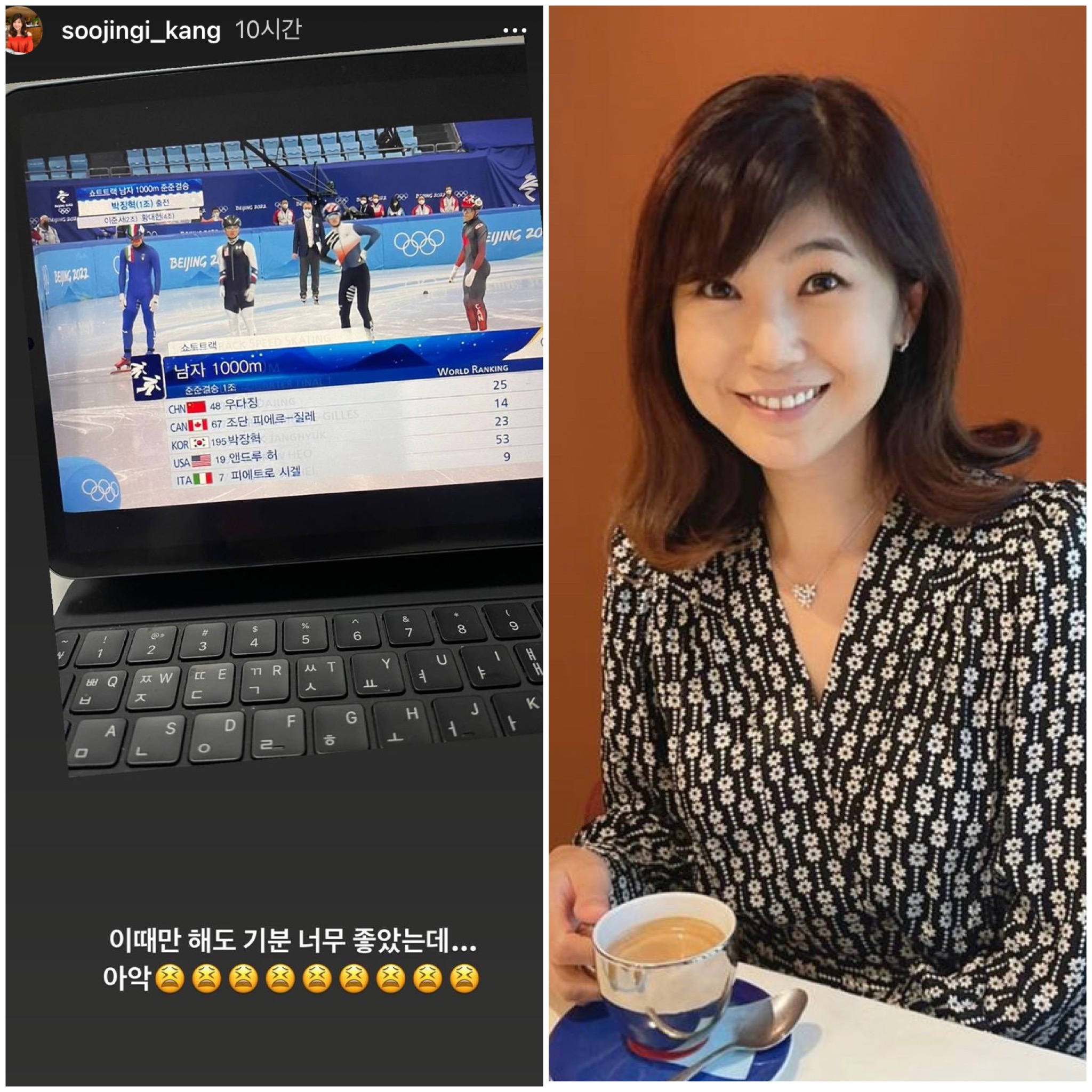 방송인 강수정은 "이때만 해도 기분 좋았는데...아악"이라며 경기 사진을 올렸다.
