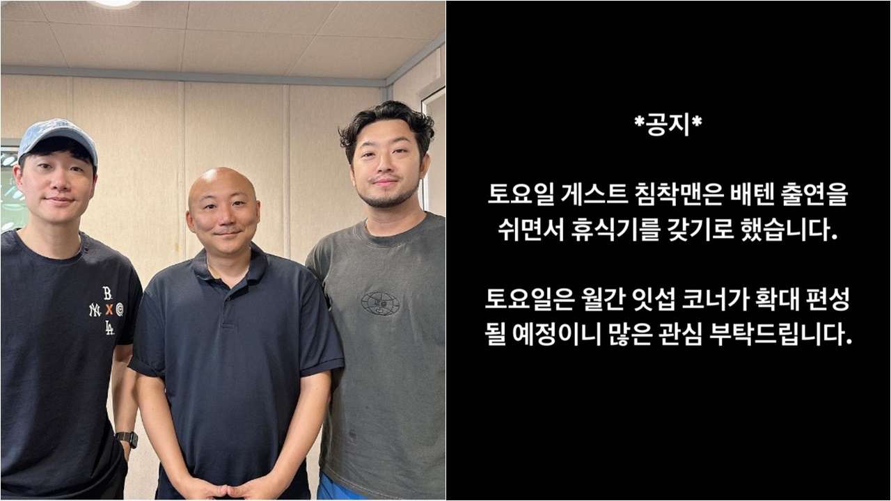 오늘(23일) SBS 파워FM '배성재의 텐' 측은 공식 인스타그램을 통해 "토요일 게스트 침착맨은 '배텐' 출연을 쉬면서 휴식기를 갖기로 했다"고 공지하며 "토요일은 월간 잇섭 코너가 확대 편성될 예정이니 많은 관심 부탁드린다"고 당부했다.