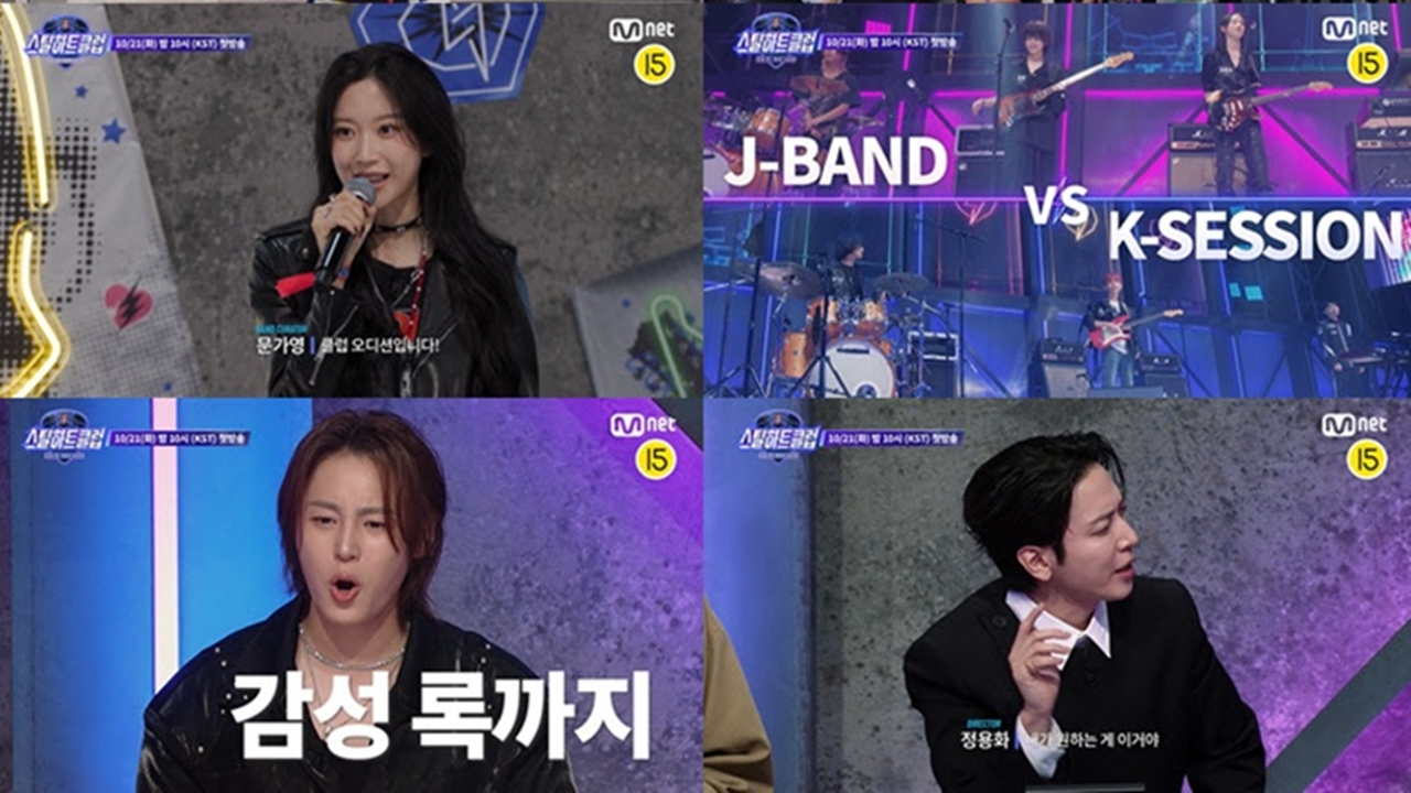 1회의 주요 미션도 공개됐다. MC 문가영은 “첫 번째 관문, 클럽 오디션입니다. 팀 대 팀 배틀로 진행된다”며 뜨거운 경쟁의 포문을 연다. 이어 ‘모델 vs 스쿨’, ‘인디 vs 아이돌’, ‘K-SESSION vs J-BAND’이라는 문구가 연이어 등장하자 현장은 “한일전!”이라는 외침과 함께 긴장감이 폭발한다.