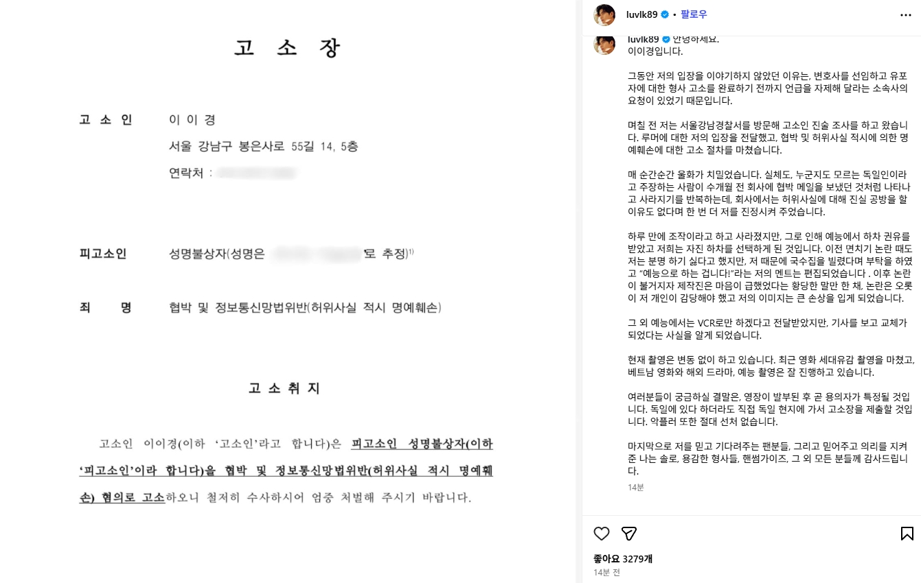 오늘(21일) 이이경은 자신의 SNS를 통해 장문의 입장문을 내고 A씨를 허위사실 적시 명예훼손 혐의로 고소했다고 밝혔다.