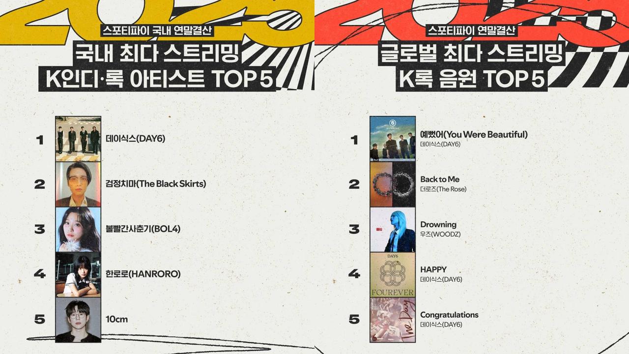 국내에서도 인디·록 장르 강세가 이어졌다. 2025년 한국에서 가장 많이 스트리밍된 아티스트는 데이식스, 뒤이어 검정치마·볼빨간사춘기·한로로·10CM가 상위권을 차지했다. 최다 스트리밍 곡은 데이먼스 이어의 ‘yours’였다.