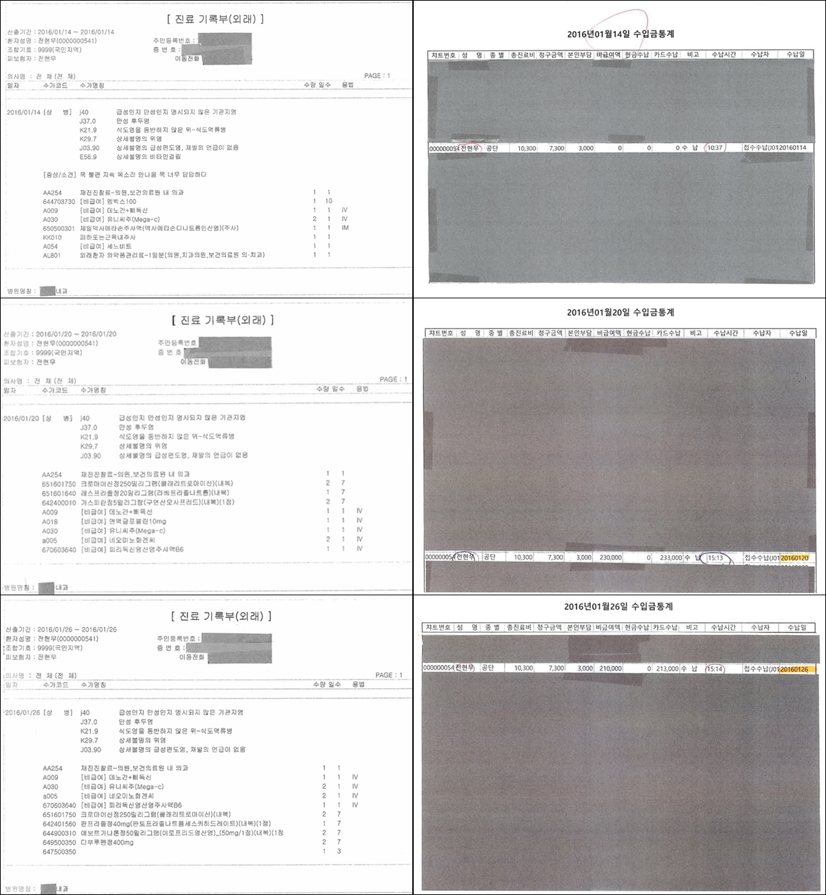 또 해당 병원의 수입금 통계 사본을 통해 진료일별 공식 수납 내역이 확인되며, 치료가 정식 진료 절차에 따라 이뤄졌다는 점도 강조했다. 이와 함께 2016년 1월 20일 수액 처치 후 발생한 의료물은 의료진 안내에 따라 1월 26일 병원 재방문 시 반납했다고 밝혔다.