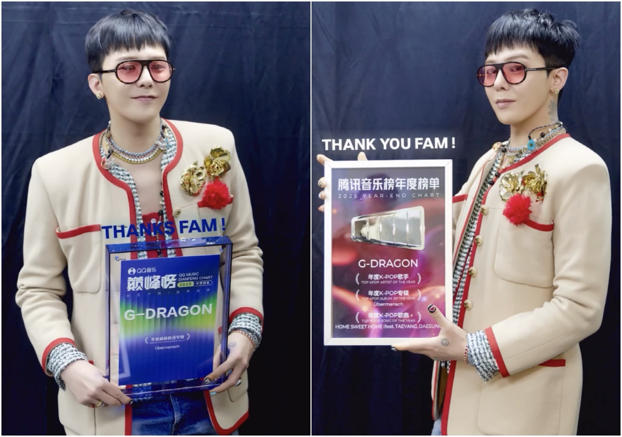 중국 최대 음악 스트리밍 그룹인 텐센트 뮤직 엔터테인먼트(TME)의 성적표 역시 화려하다. 지드래곤은 ‘TME 2025 연간 차트’에서 ‘올해의 K-POP 가수’, ‘올해의 K-POP 앨범’, ‘올해의 K-POP 곡’(HOME SWEET HOME) 부문을 모두 석권하며 3관왕에 올랐다. 이와 함께 ‘올해의 K-POP 솔로 가수 TOP 10’에도 이름을 올리며 전방위적인 활약을 입증했다.