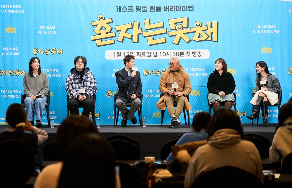 오늘(12일) 오후 서울 마포구 상암동 스탠포드호텔에서 JTBC 새 예능 프로그램 '혼자는 못 해' 제작발표회가 열렸다. 현장에는 연출을 맡은 홍상훈 CP, 권예솔 PD를 비롯해 MC 전현무, 추성훈, 이수지, 이세희가 참석해 프로그램의 기획 의도와 관전 포인트를 설명했다.