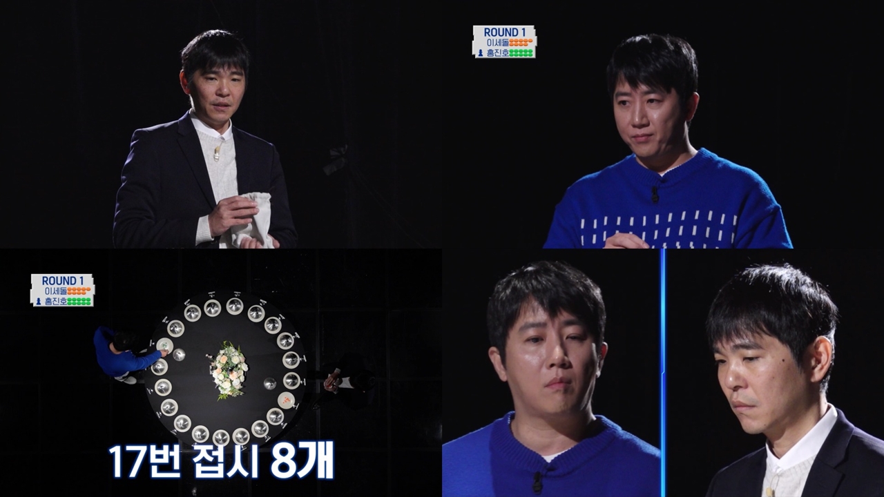 포문을 연 첫 번째 승부는 이세돌과 홍진호의 대결이었다. 첫 번째 게임 ‘기억의 만찬’은 20개의 그릇 속 토큰 개수를 오직 암기로만 기억해 같은 수의 토큰을 찾아내야 하는 게임으로, 뛰어난 기억력과 전략적 수싸움이 동시에 요구됐다. 바둑계 레전드로 1대1 대결에 특화된 이세돌과 각종 서바이벌 프로그램에서 위기 대처 능력을 증명해 온 프로게이머 출신 포커 플레이어 홍진호는 각자의 방식으로 승부에 임하며 팽팽한 긴장감을 형성했다.