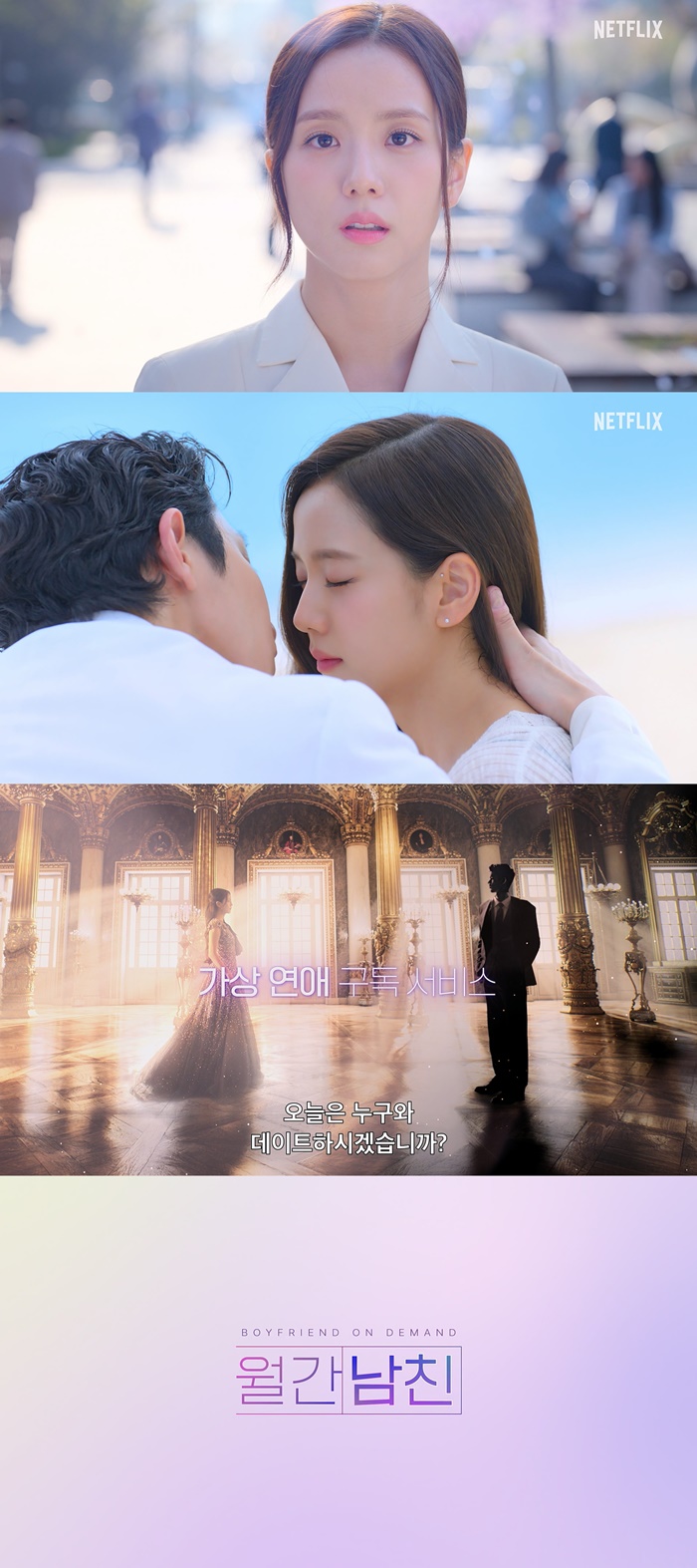 티저 예고편에서는 '월간남친'을 구독한 미래에게 상상하지 못했던 설렘의 판타지가 열린다. 로맨스 웹툰의 한 장면으로 직접 들어가는가 하면, 벚꽃이 흩날리는 봄날의 캠퍼스, 키스 직전의 바닷가까지 로그아웃하고 싶은 '현생'은 사라지고 꿈 같은 데이트가 눈앞에 펼쳐진다. 여기에 '오늘은 누구와 데이트 하시겠습니까?'라는 달콤한 멘트가 연애는 귀찮지만 여전히 설레고 싶은 이들에게 새로운 도파민을 예고한다.