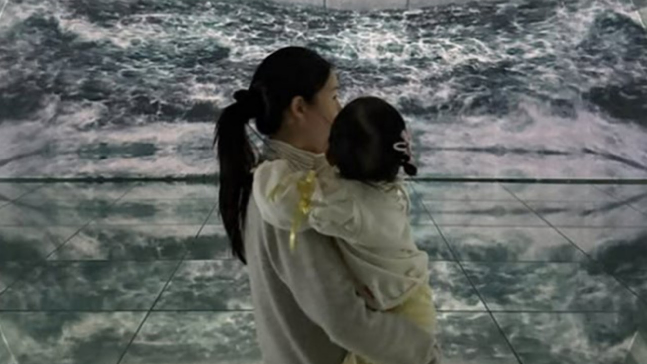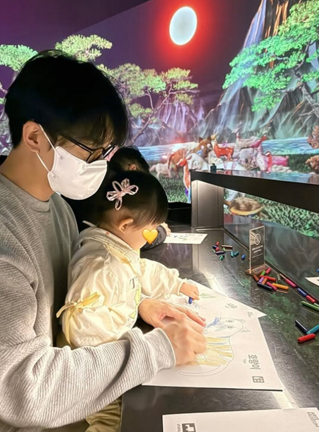 공개된 사진에는 이다인과 가족들의 화목한 모습이 담겨 있다. 한 미디어 아트 전시관을 찾은 두 사람은 딸과 함께 작품을 관람하고 있다.