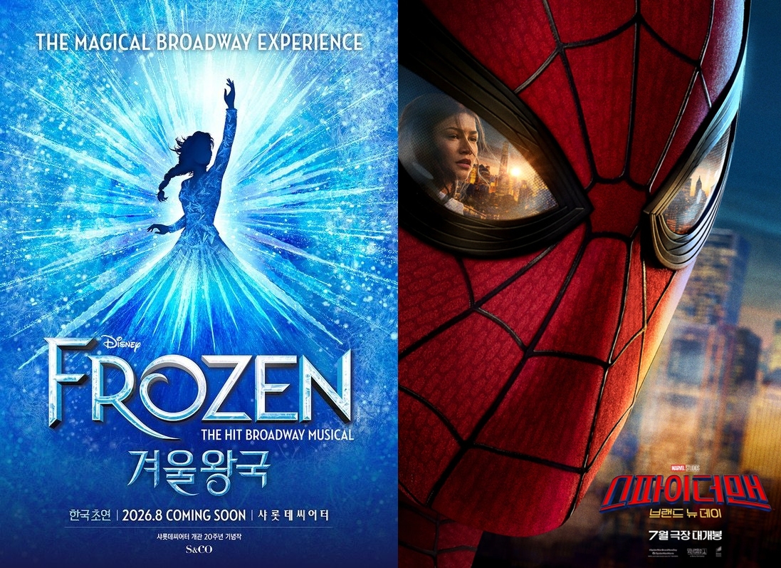 뮤지컬 '겨울왕국'·영화 '스파이더맨: 브랜드 뉴 데이’ 포스터 ⓒ클립서비스·소니 픽쳐스