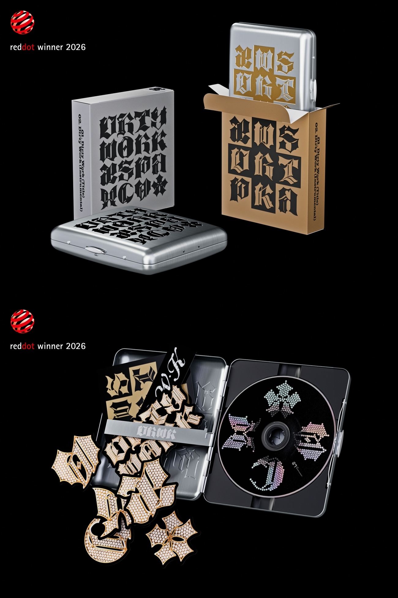 수상작 '더티 워크' 더티 케이스 버전은 에스파의 미래 지향적인 브랜드 정체성을 현실 세계(Real World)의 물리적 형태로 확장한 것이 특징이다. 블랙레터(Blackletter) 서체, 서체와 결합된 십자가형 그래픽 등 시각 언어를 통해 주체적인 태도를 실체적인 구조로 구현하고, 독립적인 연대와 단호한 의지를 표현했다.