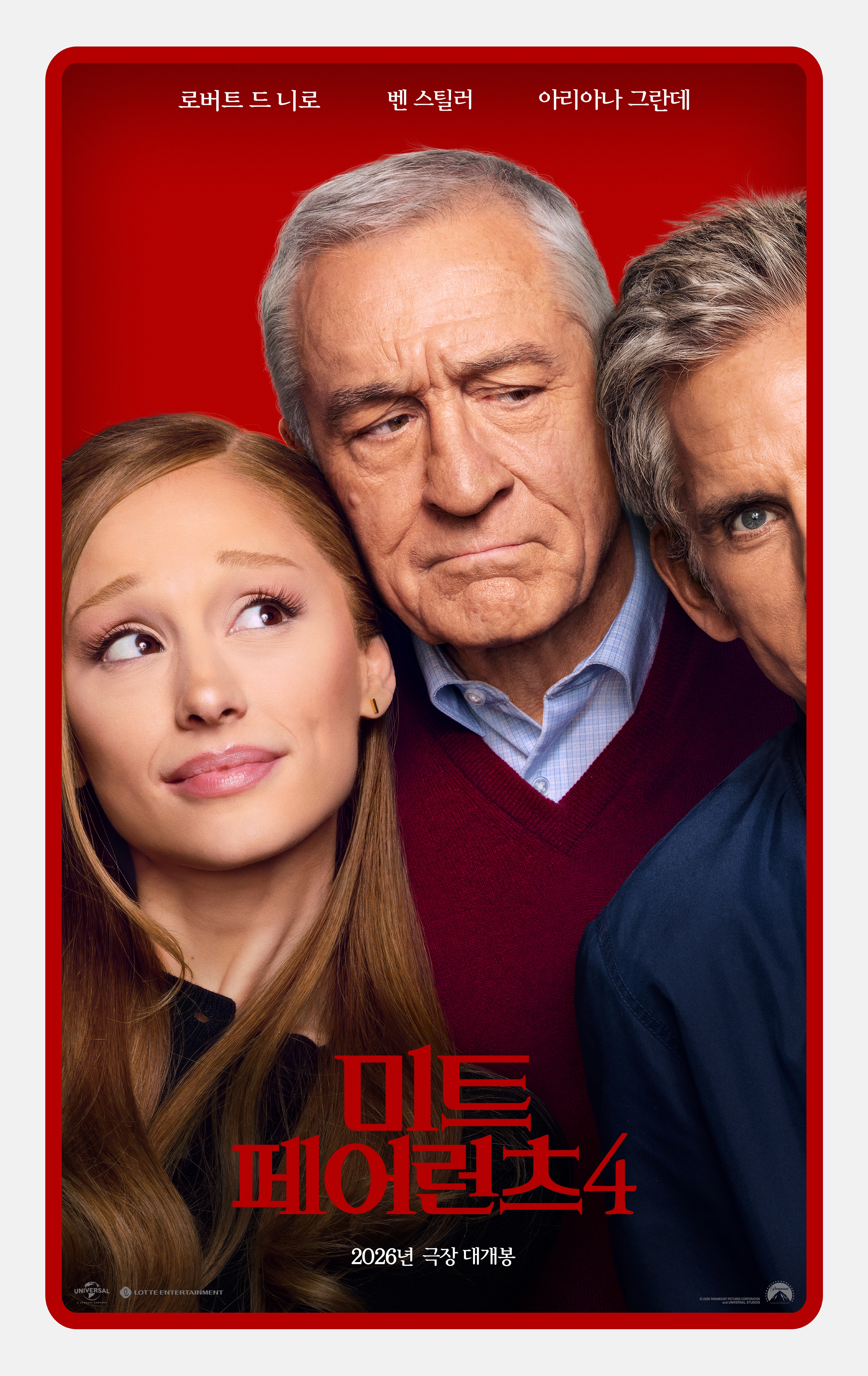 변함없는 존재감으로 시리즈의 얼굴이 된 로버트 드 니로, 벤 스틸러가 특유의 호흡으로 유쾌한 케미를 선보이는 가운데, 아리아나 그란데의 거침없는 활약은 작품에 새로운 활력을 불어넣을 것이다. 1차 포스터와 예고편을 공개한 '미트 페어런츠 4'는 유쾌한 코미디의 귀환으로 극장가를 사로잡을 것이다.