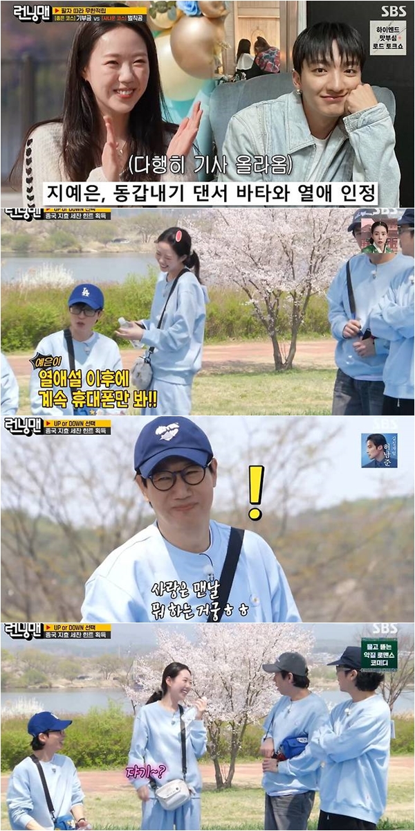 이날 지예은은 바타와의 열애를 공식 인정했고, 멤버들은 두 사람의 썸 비화를 전했다. 지석진은 "내가 눈치를 챘어야 한다. 바타랑 나랑 예은이랑 앨범 춤 연습을 했다. 연습하고 난 뒤 택시를 태워 보냈는데 예은이가 다시 돌아와서 바타를 만나러 갔더라"고 운을 뗐다.