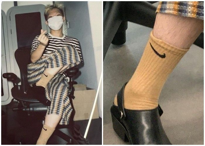 이찬혁은 의자에 앉아 카메라를 바라보며 사진을 찍었다. 스트라이프 패턴 의상을 입고 손가락 하트 포즈를 취했다. 긴 발목 양말을 신은 발목 클로즈업 사진도 더했다.
